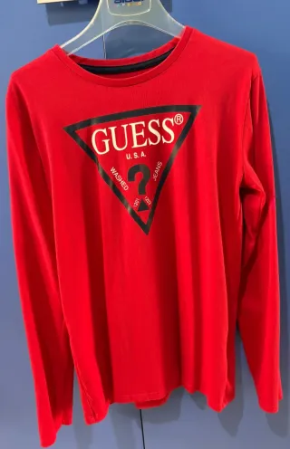 Maglietta a maniche lunghe per bambino con logo Guess. 14 anni - Colore rosso vivace. - Logo Guess triangolare nero e bianco sul davanti. - Maniche lunghe.