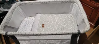 Culla con letto del marchio Jane, ideale per tenere il bambino vicino. Design con stampa di stelle grigie. Include materasso e biancheria. Lato ribaltabile per facilitare l'accesso. Utilizzata solo 4 mesi. Regalo piumone abbinato. Può essere posizionata a diverse altezze, inclinata in piedi e in testa. Costo nuovo 240 euro da Dulce bebe. REGALO set di lenzuola di coralina. REGALO set di lenzuola primavera.