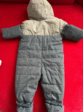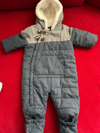 Tuta da esterno per neonato, taglia 74 cm. Perfetta per proteggere dal freddo. - Tessuto trapuntato. - Cappuccio foderato in pelliccia sintetica. - Chiusura con bottoni a pressione e laccetti. - Maniche e fondo gamba elasticizzati.