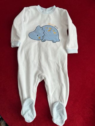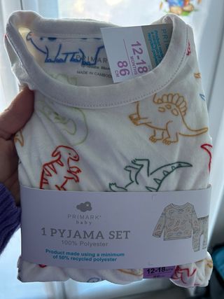 Pigiama per neonato Primark con fantasia di dinosauri colorati. - Taglia 12-18 mesi (86 cm). - Composizione: 100% poliestere. - Realizzato con un minimo del 50% di poliestere riciclato. - Prodotto in Cambogia.