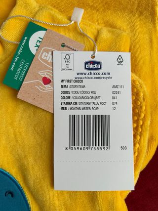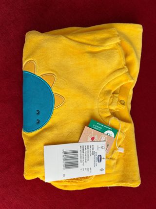 Morbido pigiamone giallo per neonato con un simpatico disegno sul davanti. - Materiale in ciniglia. - Taglia 12 mesi. - Chiusura con bottoni a pressione. - Certificazione Oeko-Tex.