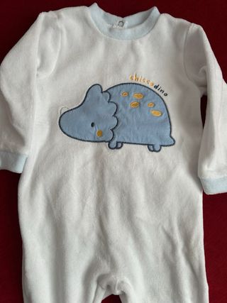 Pigiamone in morbido tessuto per neonato, con simpatico dinosauro azzurro. - Colore bianco con dettagli azzurri. - Applicazione dinosauro con dettagli gialli. - Piedini antiscivolo azzurri.