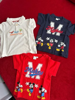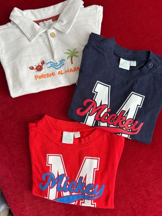 Set di tre magliette a manica corta per neonato. - Una maglietta bianca con stampa Portami al mare, un granchio, onde e una palma. - Una maglietta blu scuro con stampa Mickey. - Una maglietta rossa con stampa Mickey.
