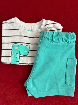 Set composto da maglietta a maniche corte e pantaloncini. - Maglietta a righe bianche e nere con stampa di dinosauro. - Pantaloncini tinta unita verde acqua con tasca. - Marchio Mayoral.