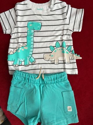 Set di quattro completi corti per neonato, perfetti per la stagione calda. Ogni completo include una t-shirt e un paio di pantaloncini. Taglie 3-6 e 9 mesi.