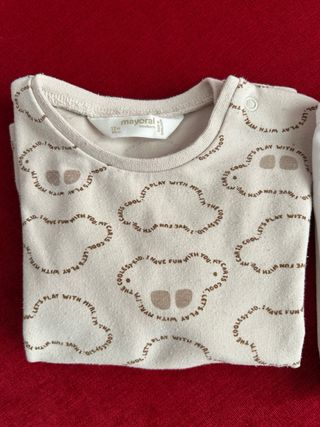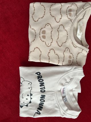 Set di due magliette a manica lunga per neonato. - Maglietta beige con fantasia Mayoral - Maglietta bianca con stampa Pronto Nonna e disegno di un dinosauro Blukids - Taglia 12 mesi / 74 cm.