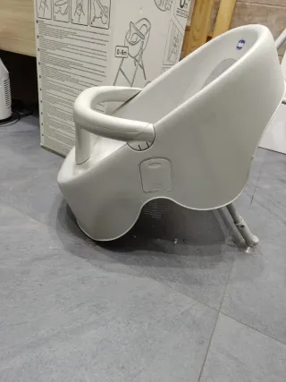 Alzasedia Chicco con fantasia a righe arancioni e bianche. Facile da agganciare alla sedia. - Seduta imbottita. - Cinture di sicurezza. - Design a righe. Trasporta ile facilmente. Si richiude su se stesso e si porta a tracolla