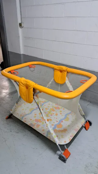 Box per bambini con struttura arancione e fantasie colorate sul telo. - Telaio in metallo. - Tasche portaoggetti laterali. - Anelli gioco. - Ruote per spostamento.