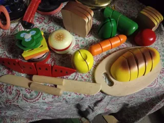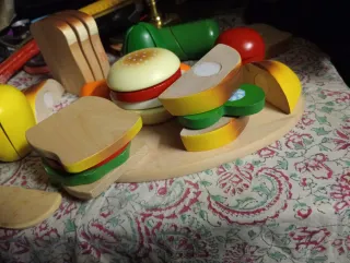 Set di costruzioni in legno per creare panini e altri alimenti. - Include pane, hamburger, verdure, carote, pomodoro, mela e coltelli. - Realizzato in legno. - Pezzi colorati per un gioco stimolante.