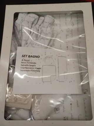 Set da bagno per neonato composto da 4 pezzi. - Sacco portatutto - Salvietta spugna - Coprifasciatoio da viaggio - Saponetta profumata
