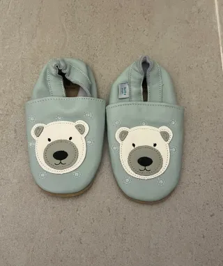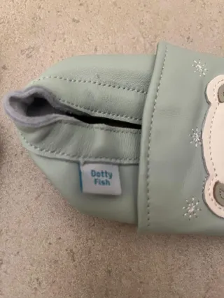 Ciabattine comodissime per bimba/o con disegno dell'orso polare. La marca è Dotty fish. La taglia è espressa in anni 2-3 anni ed equivale al numero 25. Sono nuove. Non sono mai state utilizzate. Il colore è verde acqua. Ha la suola in pelle scamosciata antiscivolo che garantisce aderenza e stabilità come a piedi nudi. È flessibile e leggera, per una libertà di movimento senza limiti. Il materiale è 100% pelle. Ha un elastico alla caviglia per una calzata sicura e stabile. Sono ottime per l’uso al coperto, soprattutto su superfici dure come pavimenti in legno o in laminato. Le misure della suolq sono: 15,5 cm x 7 cn