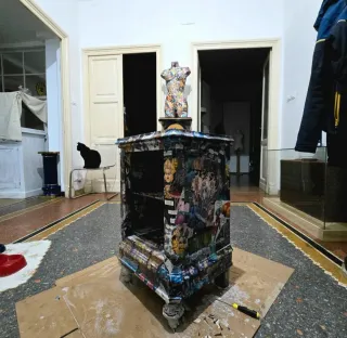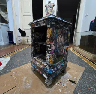 Comodino unico nel suo genere, decorato con immagini a tema Marvel. - Design personalizzato con fumetti e personaggi Marvel. - Struttura a giorno con ripiani. - Base decorata con elementi artistici. - Altezza 70 base 40x40