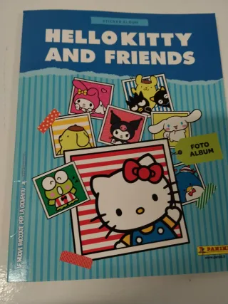 Album di figurine Hello Kitty and Friends della Panini. - Copertina con design a righe azzurre. - Illustrazioni colorate di Hello Kitty e altri personaggi. - Spazio per raccogliere le figurine.