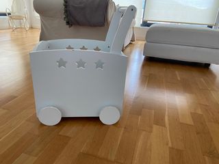 Carrello in legno bianco, perfetto per riporre i giocattoli. Il suo design è semplice e funzionale. - Colore bianco. - Dettagli con stelle traforate. - Ruote per facilitare il movimento.