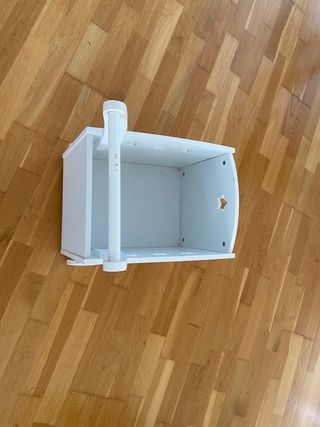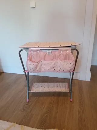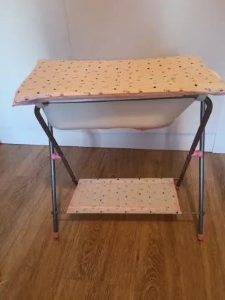 Vaschetta per cambio con struttura metallica pieghevole, ideale per giochi di imitazione. Include un fasciatoio imbottito e un design per bambini. Ha una piccola pittura.