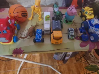 Lote vario di giocattoli per bambini. Include figure di dinosauri, veicoli giocattolo di diversi modelli, palla da basket e figura di Peppa Pig.