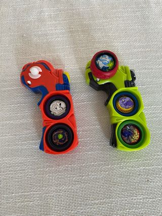 Set di due giocattoli racer colorati, ideali per i più piccoli. - Un giocattolo è rosso e blu con un personaggio bianco e uno verde. - L'altro giocattolo è verde e rosso con un personaggio viola e un altro blu.
