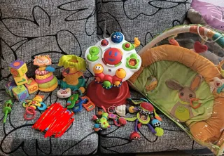 Set di giocattoli per neonati composto da 12 articoli: Set di blocchi impilabili morbidi. Set di anelli impilabili morbidi con divertente testa di leone sopra. Sonaglino verde in legno. Due giocattoli con suoni, parti girevoli e diverse texture. FisherPrice, con gancio per passeggino. Albero con pallina Playskool. Tavolo delle attività Molto, con parti mobili che stimolano il bambino in diversi modi. Due asinelli colorati, con materiali, rumori e texture diversi. Con ganci per passeggino. Coperta da gioco con arco. Cappellini a forma di orso. Gancio per ciuccio a forma di asinello.