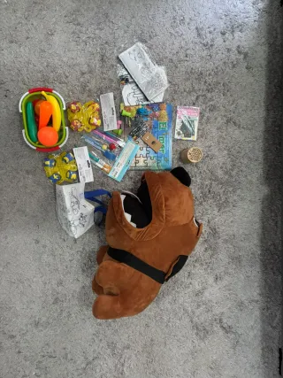 Set di giocattoli per bambini. - Peluche di cane marrone con dettagli neri grande. - Cestino di frutta in plastica. - Set di pennarelli e matite colorate. - Puzzle. - Quaderno da disegno. - Altri piccoli giocattoli. - Include cane Fisher-Price.