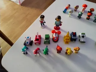 Lotto misto di giocattoli assortiti, perfetti per collezionisti o per creare nuove avventure. - Personaggi vari con dettagli colorati. - Include un personaggio dei Puffi e un guerriero romano. - Presente anche un'auto sportiva rossa.
