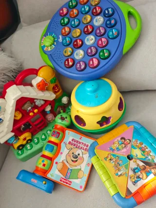 Set di giocattoli educativi per bambini piccoli, incluso un tabellone con lettere e numeri, un libro musicale e altro. Lote a 30 euro ciascuno da 12 euro. - Tavoletta interattiva con lettere e numeri. - Libro musicale Cuentos Musicales di Fisher-Price. - Giocattolo trainabile a forma di aspirapolvere. - Giocattolo di lacci con forme. - Giocattolo di fattoria con animali.
