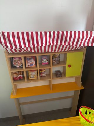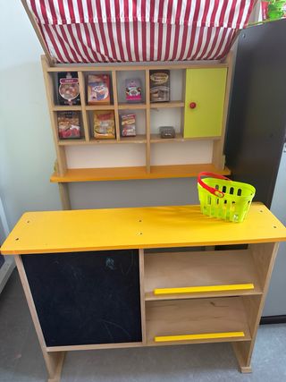 Vendo negozio di legno per bambini, ideale per giochi simbolici, cucine o angoli di gioco. Include bancone, scaffali, lavagna laterale e tettuccio in tessuto a righe. Molto resistente e stabile. Caratteristiche: struttura in legno, scaffali superiori per prodotti, bancone ampio, lavagna per scrivere i prezzi, porta e scomparti di stoccaggio, include cestino per la spesa (come si vede nella foto). Dimensioni perfette per bambini piccoli. Ideale per stimolare l'immaginazione, il gioco di ruolo e l'apprendimento. Stato: buone condizioni generali, con segni normali di utilizzo (vedere le foto).
