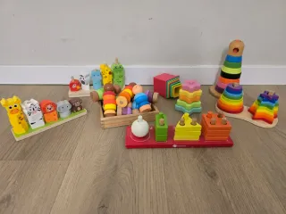 Set di giocattoli in legno, ideale per asili nido o per casa. Sono educativi e colorati. Singoli a 3€, pack a 20€. Include: Giocattolo di intarsio a forma, Gioco di anelli da impilare, Giocattolo di animali da infilare, Gioco di costruzioni con blocchi.