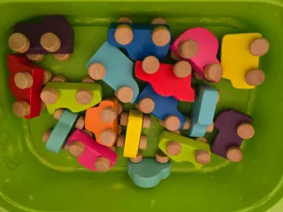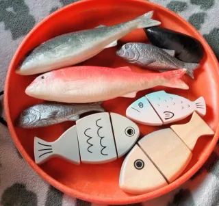 Set di giocattoli di legno a forma di pesce. Include varie parti per giocare. - Pesce di legno in vari colori. - Pezzi di giocattolo per bambini.