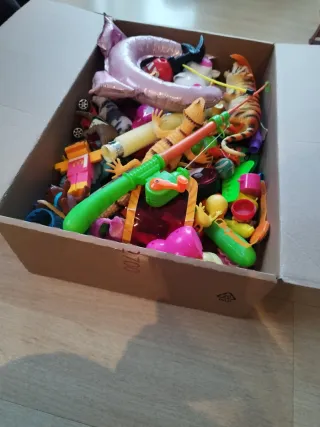 Scatola piena di vari giocattoli per bambini, la maggior parte piccoli. Include animali, macchine, gioco di pesca, figure di personaggi, strumenti...