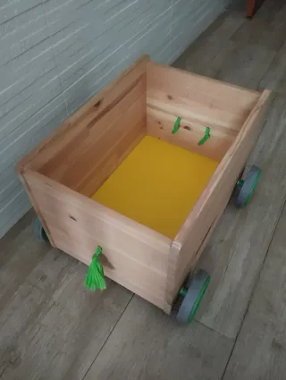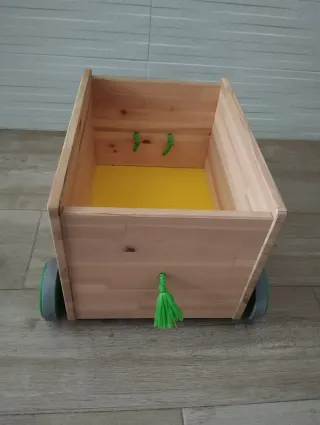 Carrello in legno con base gialla e ruote grigie. Ideale per conservare e trasportare giocattoli. Caratteristiche: costruzione in legno chiaro, base interna gialla, ruote grigie, decorazione con corda verde sulla parte anteriore.