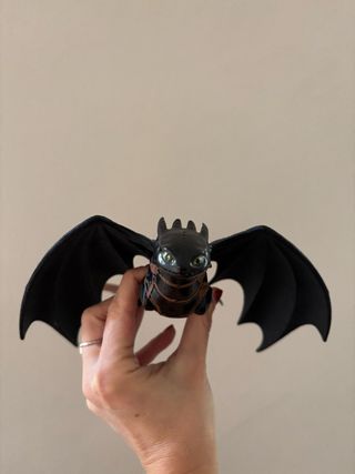 Statuina del drago del film Come addestrare il tuo drago. Dettagli delle ali nere, occhi verdi brillanti, design ispirato al personaggio. +4 anni