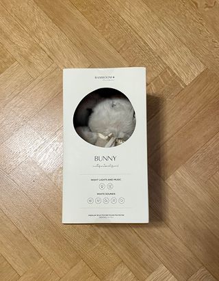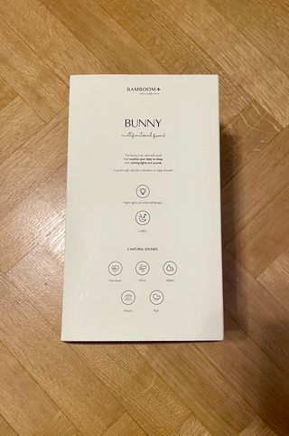 Coniglietto Bunny di Bamboom, un amico multifunzionale. Realizzato in poliestere riciclato. - Funzione luci notturne e musica. - Diverse melodie di rumori bianchi. - Design italiano.