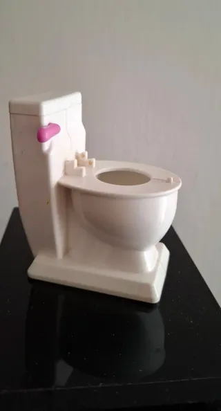 Vendo accessorio originale Mattel (anno 2009) per case delle bambole tipo Barbie o simili. Si tratta di un simpatico WC bianco con con dettagli curati. Marca: Mattel Inc. (originale). Interattività: Dotato di leva dello sciacquone rosa funzionante e altoparlante sul retro per riprodurre il suono dell'acqua. Dettagli: L'interno della tazza mostra l'effetto dell'acqua azzurra. Alimentazione: Funziona con batterie (vano situato sotto la base, protetto da vite). Stato: Buone condizioni estetiche come da foto.