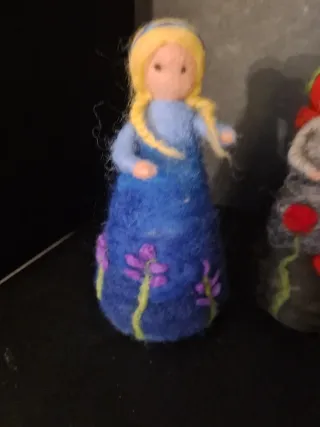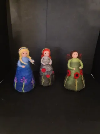 Set di tre bamboline (cm14x8) realizzate a mano in stile Waldorf. - Bambola con abito blu decorato con fiori viola. - Bambola con abito grigio e fiori rossi. - Bambola con abito verde e fiori rossi.