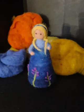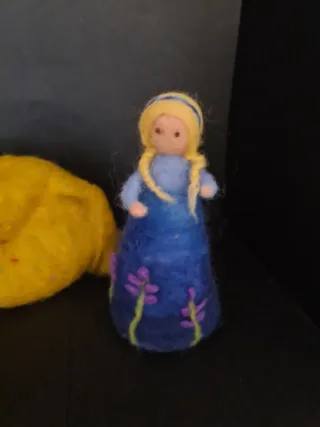 Fatina artigianale in stile Waldorf, realizzata a mano con cura (cm7x14) - Vestito blu decorato con fiori viola. - Capelli biondi intrecciati. - Materiali naturali.