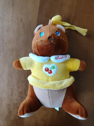 Orsetto di peluche marrone con dettagli ricamati. Usato pochissimo. - Maglietta gialla con colletto bianco. - Ricamo di ciliegie su cuore. - Fiocco giallo sulla testa. - Dettagli ricamati sul viso.