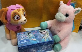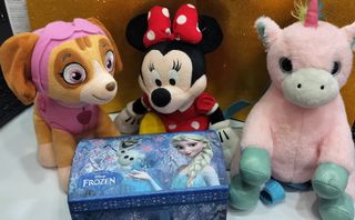 Lotto composto da tre grandi peluche 35 cm Minnie e una scatola Disney Frozen. Un'idea regalo perfetta per i più piccoli. - Peluche di Skye (Paw Patrol). - Peluche di Minnie Mouse. - Peluche di un unicorno rosa. - Scatola decorata con personaggi di Frozen (Elsa e Olaf).