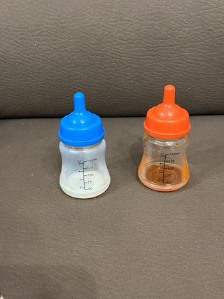 Due biberon per bambola Cicciobello, uno con tappo blu e uno con tappo arancione. Presentano misurazioni graduate. - Biberon con tappo blu. - Biberon con tappo arancione.