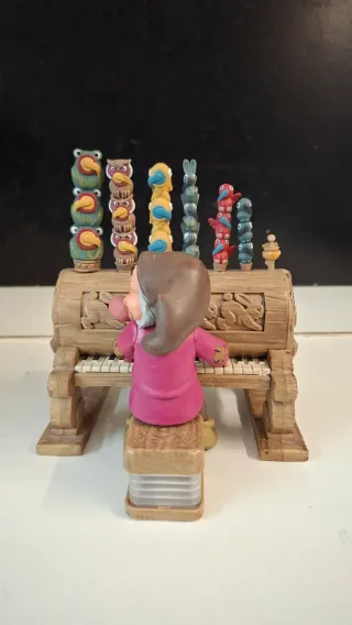 Pupazzo di Brontolo, uno dei sette nani di Biancaneve, che suona il pianoforte. Premento il seggiolino gli stantuffo si muovono