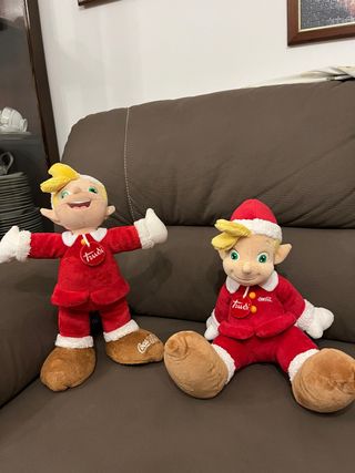 Due simpatici peluche Trudi a tema Coca-Cola, raffiguranti elfi natalizi. - Vestiti rossi con dettagli bianchi. - Cappello natalizio. - Logo Coca-Cola sulle scarpe.