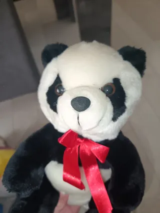 Adorabile peluche a forma di panda, perfetto per un regalo o per collezionisti. - Morbido al tatto. - Dettagli neri e bianchi. - Fiocco rosso sul collo.