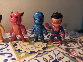Set di personaggi giocattolo ispirati a Stumble Guys. Include un drago rosso, un ninja blu e un supereroe blu e rosso. - Personaggio drago rosso - Personaggio ninja blu - Personaggio supereroe SG