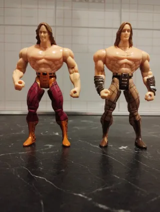 Lotto di action figure Toy Biz Hercules. - Due action figure incluse. - Personaggi muscolosi con capelli lunghi. - Un personaggio indossa pantaloni rossi e arancioni con stivali arancioni. - L'altro personaggio indossa pantaloni a rete marroni con stivali marroni e accessori sui polsi.