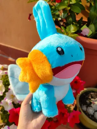 Un carinissimo peluche di Mudkip, originale del Pokémon Center Japan e Takara Tomy! 🎀 Coloratissimo e pelosissimo, è super adorabile! Ha un'espressione allegra e irresistibile, ti metterà di buon umore solo a guardarlo! ✨🌊