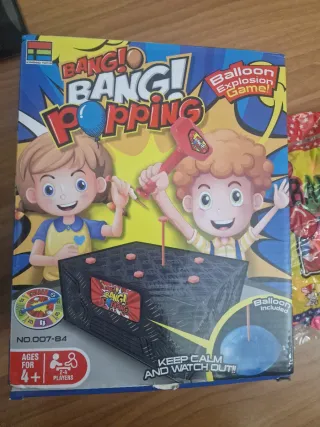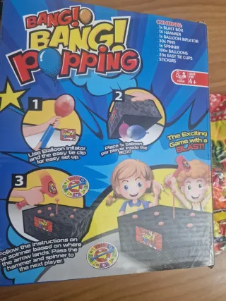 Gioco da tavolo Bang Bang Popping per 2-4 giocatori. Divertente gioco con palloncini scoppiettanti - Età consigliata: 4+ anni. - Include palloncini, martello, chiodini, spinner, pompetta per gonfiare i palloncini - Scatola originale.