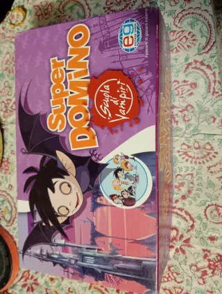 Gioco da tavolo Super Domino Scuola di Vampiri. - Illustrazioni a tema vampiri. - Personaggi colorati. - Scatola viola con dettagli in arancione.