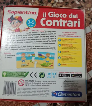 Gioco educativo Sapientino Il Gioco dei Contrari di Clementoni, ideale per imparare parole nuove e il loro significato. - Età consigliata: 3-5 anni. - Include 24 tessere puzzle illustrate. - Made in Italy.
