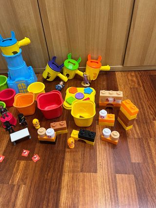 Lotto misto di giochi per bambini, ideale per stimolare la creatività e il divertimento. - Torre da gioco blu e gialla. - Set di secchielli colorati (rosso, arancione, giallo, verde, blu). - Blocchi da costruzione di varie forme e colori. - Personaggi e accessori. - Coni stradali giocattolo.