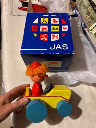 Un simpatico gioco in legno risalente agli anni '80, con il marchio JAS. - Personaggio con capelli arancioni e abiti rossi. - Trattore giallo con ruote blu. - Scatola originale con disegni colorati.
