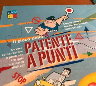 Gioco da tavolo Patente a Punti, in ottime condizioni. - Perfetto per imparare le regole della strada in modo divertente. - Ideale per 2 o più giocatori. Contiene: - una plancia di gioco con percorso; - uno spinner con treccetta; - 4 macchinine segnaposto; - 1 macchinina della polizia; - 4 tabelle patenti; - 4 segnapunti colorati; - 108 carte delle domande e risposte; - 36 carte imprevisto; - regolamento di gioco.